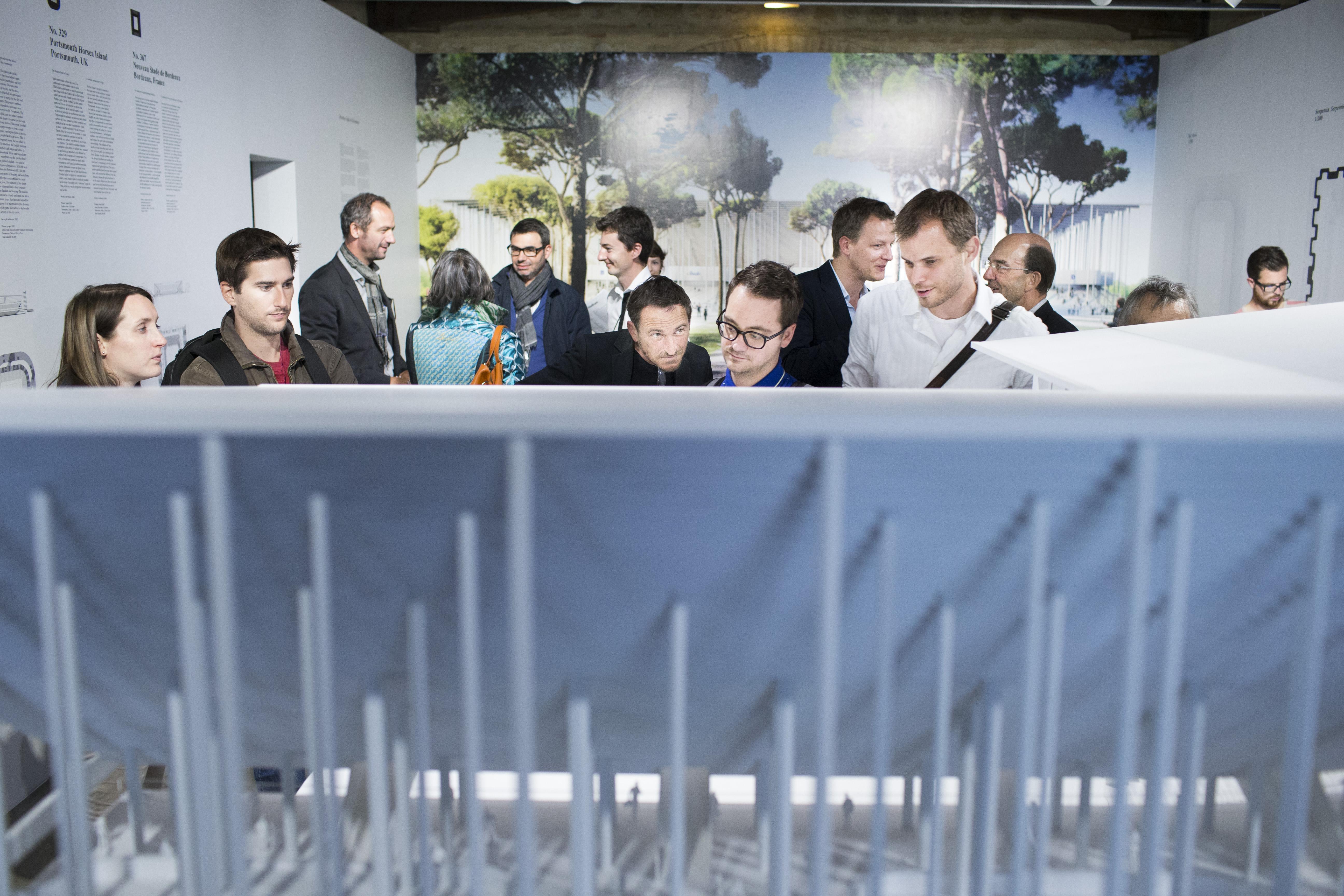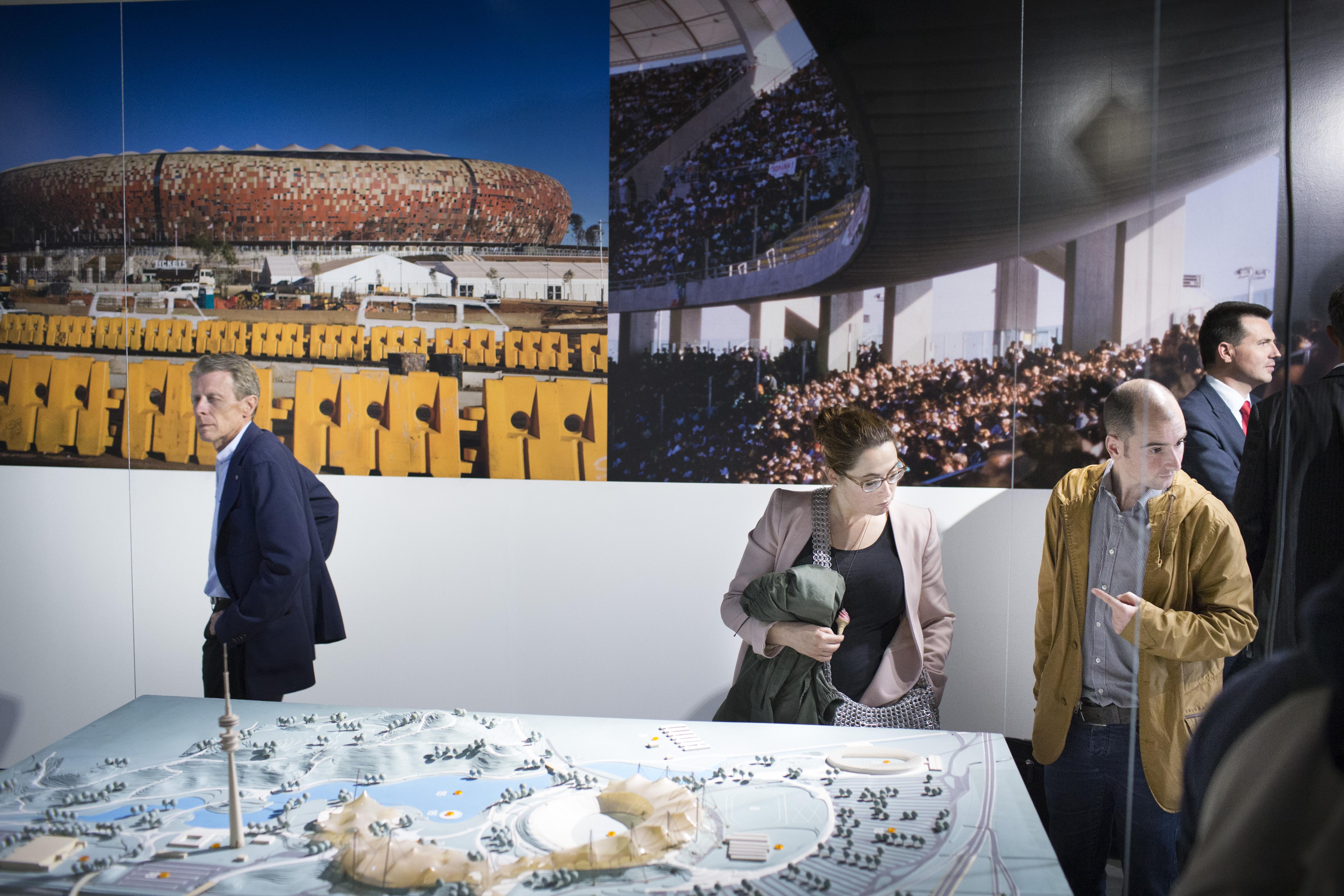 La scénographie de l'exposition immerge le public dans la complexité tout à la fois familière et extraordinaire de ce temple contemporain qu’est le stade.